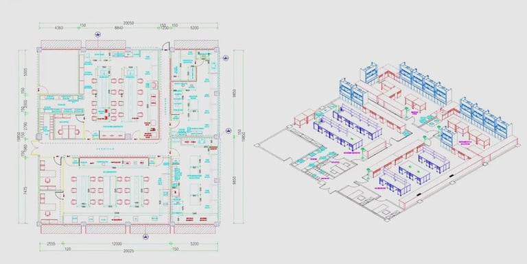 Com o briefing em mãos, elabora-se um desenho de layout preliminar em formato CAD ou planta baixa. Nesta representação simplificada, posicionam-se bancadas, armários, capelas de exaustão e demais módulos conforme o fluxo identificado. O cliente revisa o layout para confirmar circulação, acessibilidade e compatibilidade com os equipamentos. Comentários e ajustes são registrados para adequar espaços de trabalho, pontos de utilidades e rota de evacuação, garantindo que a proposta atenda às expectativas antes de avançar.